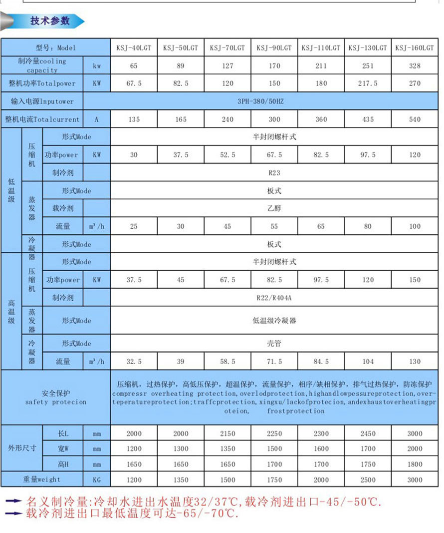 1.二元復(fù)疊低溫制冷機(jī)組:主要有低溫級(jí)活塞式復(fù)疊機(jī)組及低溫級(jí)螺桿式復(fù)疊機(jī)組等兩個(gè)系列;該系統(tǒng)采用二元復(fù)疊制冷系統(tǒng),由高溫級(jí)(R404A/R22)低溫級(jí)R23組合而成,可提供-30℃- -85℃超低溫工藝?yán)湓矗粰C(jī)組制冷量范圍在5kw~700kw;