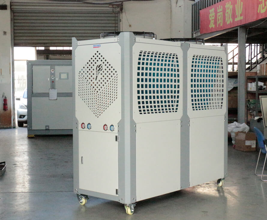 5、風冷式工業(yè)箱式制冷機組;通過風扇以空氣作為冷凝方式的冷水機;